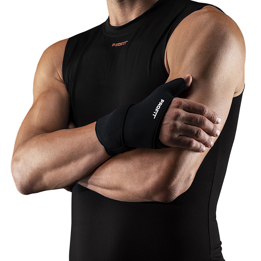 Introducir el pulgar por el orificio de la muñequera. El logo PROFIT debe quedar del lado de los dedos.