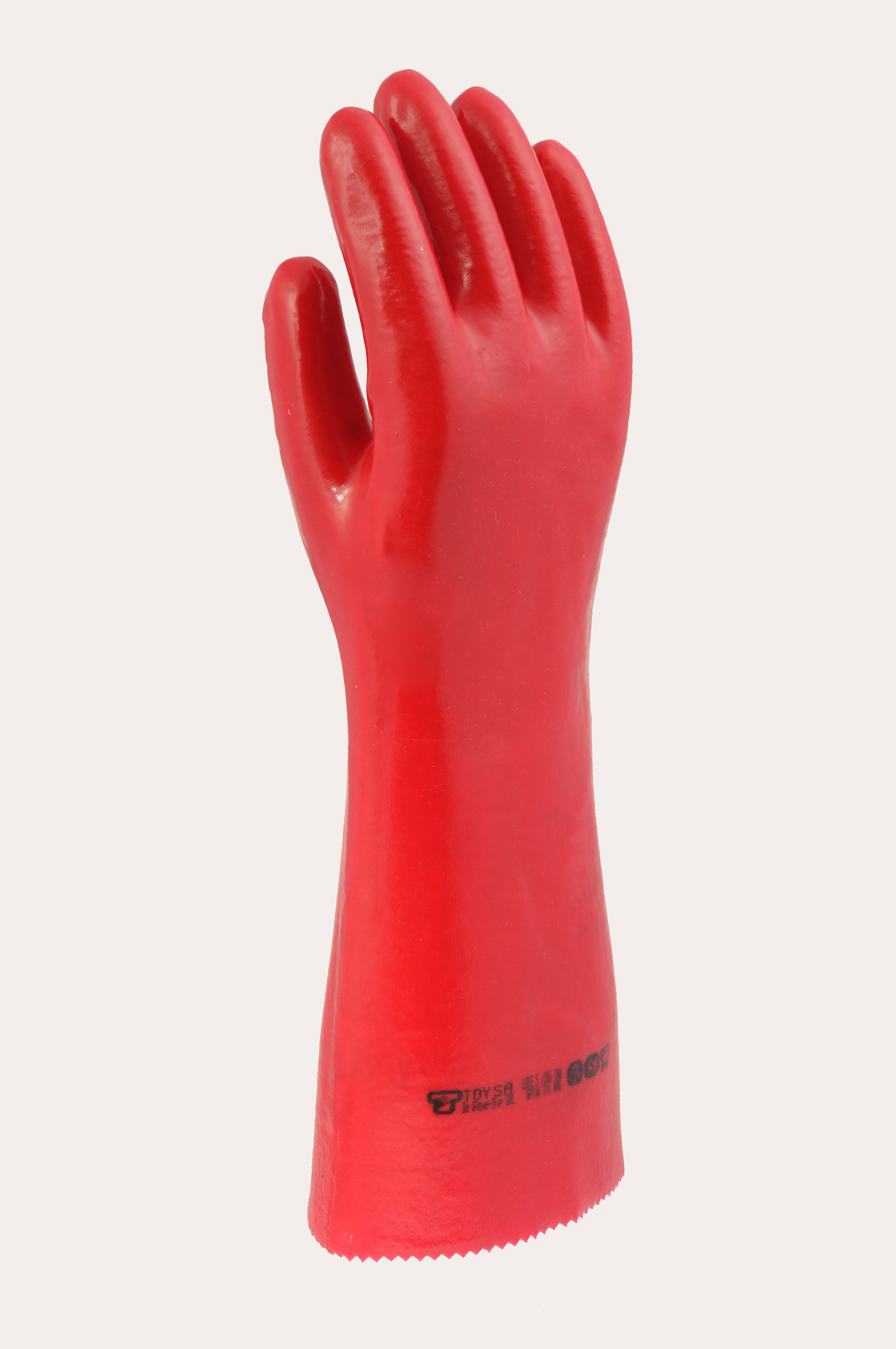 El guante de PVC es un producto de uso industrial que brinda seguridad a los miembros superiores del trabajador. Las áreas protegidas dependerán del largo del guante a utilizar que van desde el modelo corto para protección de manos, hasta los guantes de 70cm de largo que protegen la totalidad del brazo, utilizado para profundidad en la inmersión. Su formulación contiene polímeros especiales que le aportan mayor resistencia química a los hidrocarburos siendo especialmente destinado para la industria petrolera Únicos con doble baño que le confieren mayor espesor otorgando mayor resistencia mecánica y mayor tiempo de resistencia a losproductos químicos. Posee una importante capacidad mecánica fundamentalmente en lo referente a resistencia a la abrasión y aldesgarro.Nodeben ser utilizados cuando hay riesgo deatrapamiento en partes móviles de máquinas. Si bien no es un producto diseñado para el uso como anti corte o anti perforación, su soporte textil y el espesor del pvcaportan gran resistencia en este sentido. Protege la piel de los riesgos químicos de los compuestos utilizados en el lugar de trabajo,fundamentalmente en uso de Hidrocarburos, Ácidos y Bases. La experiencia industrial demuestra su eficacia en contacto conSolvente alifáticos, hidrocarburos, cal, detergentes, fosfatos, glicerinas, grasas minerales y animales, nitratos, nafta, pinturas,barnices, silicatos, tintas y alcohol, entre otros.(*) Se destaca la elevada desteridad del producto, facilitando la maniobrabilidad ybrindando confort y flexibilidad en las operaciones. Es un producto de vida prolongada, no sufre degradaciones en condicionesnormales de uso. El pvc confiere un agarre óptimo para la manipulación de elementos. Aporta resistencia a los microorganismos encontacto con la transpiración del cuerpo(*) Confiere una importante resistencia térmica (*) ideal para inmersión en mediosexotérmicos. No se recomienda su uso en temperaturas superiores a 80°C ya que puede degradarse.